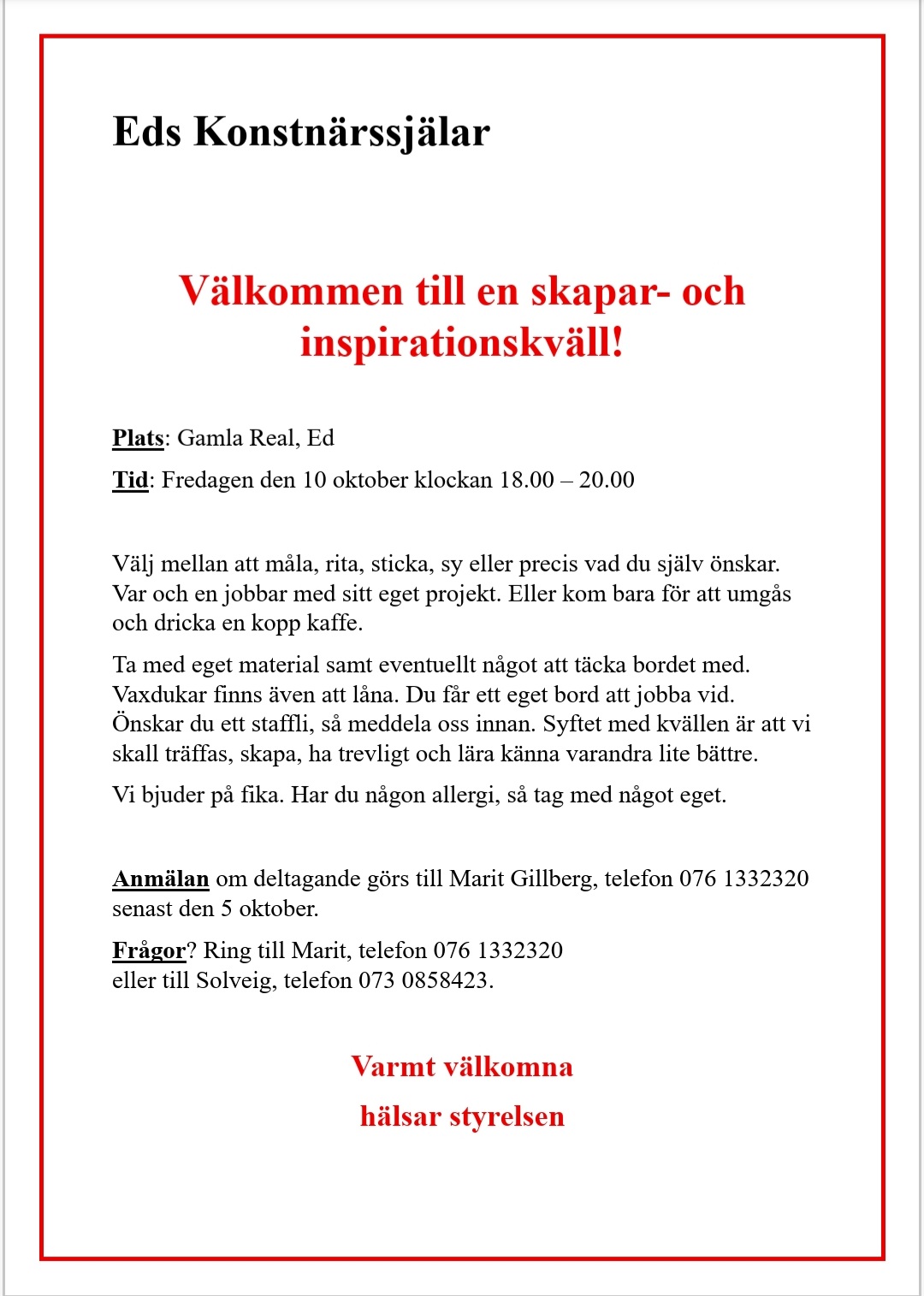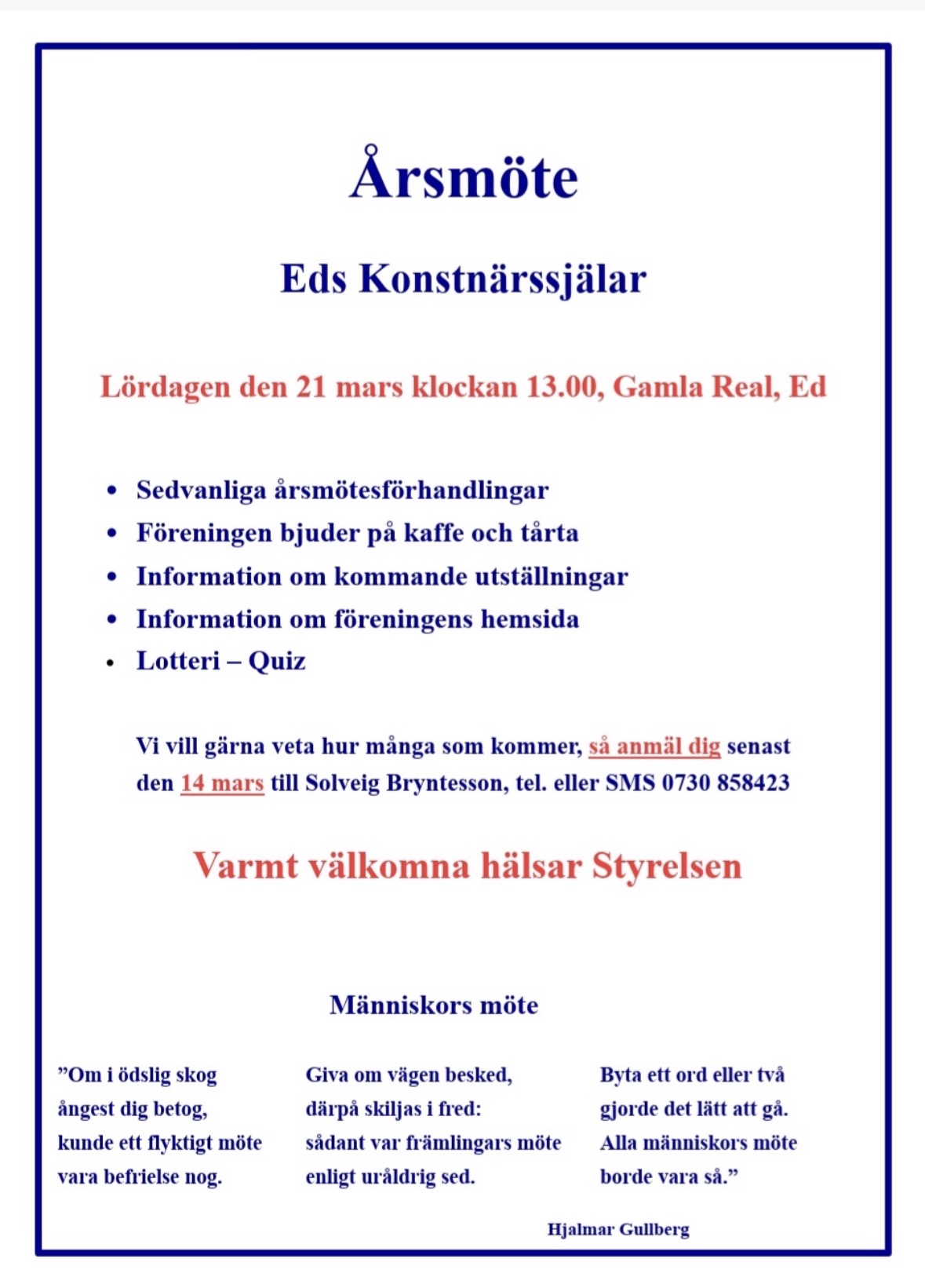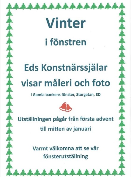 Nu är det dags för årets sista utställning, vår fönsterutställning med vintertema i f.d. SEB-lokaler i Ed. Utställningen pågår från första advent till mitten av januari. Det är 28 medlemmar som deltar med måleri och foto.